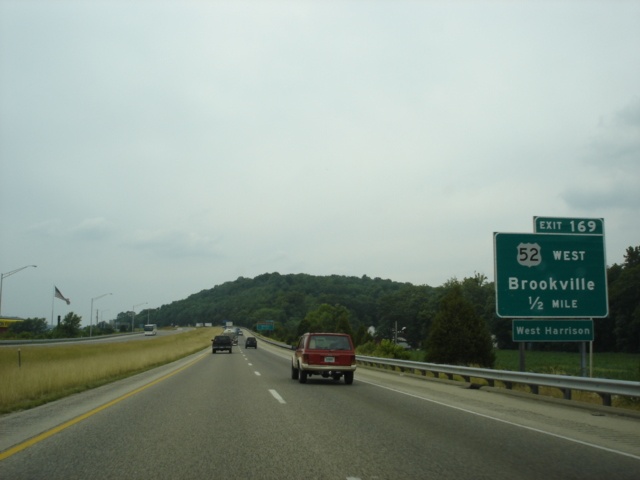 Interstate 74 and U.S. 52 West at Exit 169 - U.S. 52 West - Brookville/West Harrison. The town of Brookville is 14 miles to the northwest. (Photo taken 7/11/05) |