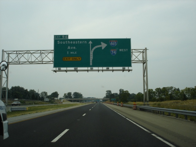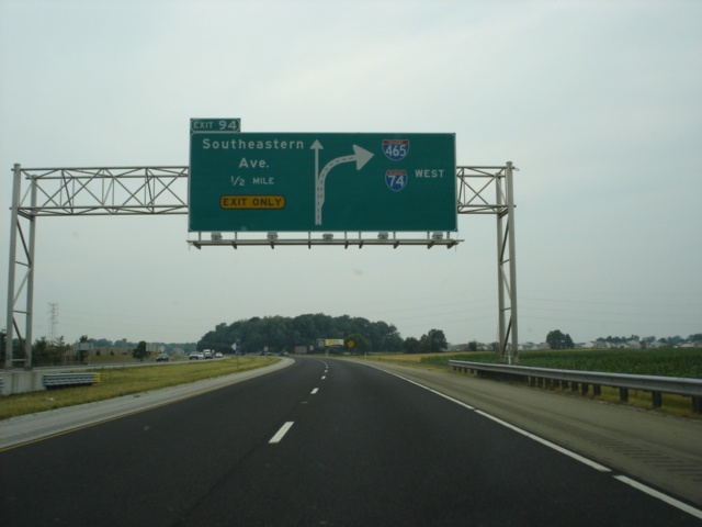 Interstate 74 West and U.S. 421 North approaching Exit 94 - Southeastern Avenue - 1/2 mile. (Photo taken 7/11/05) |