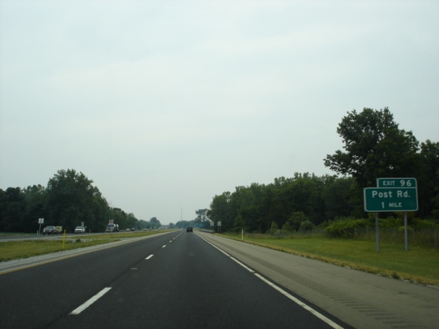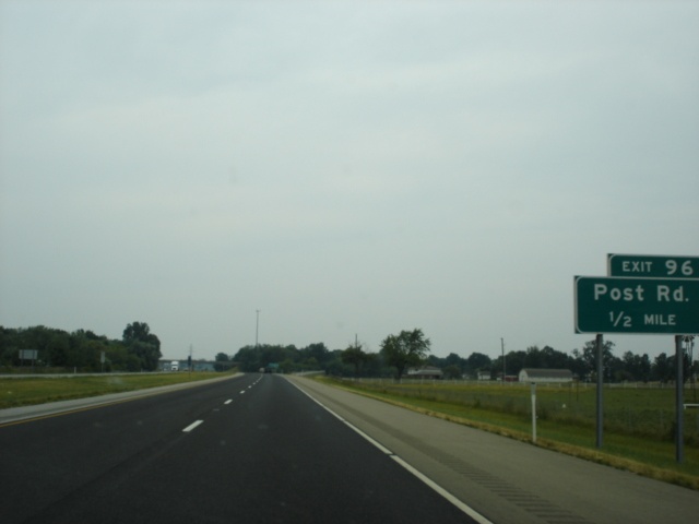 Interstate 74 West and U.S. 421 North approaching Exit 96 - Post Road - 1/2 mile. (Photo taken 7/11/05) |