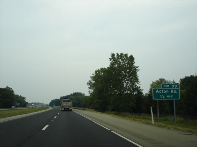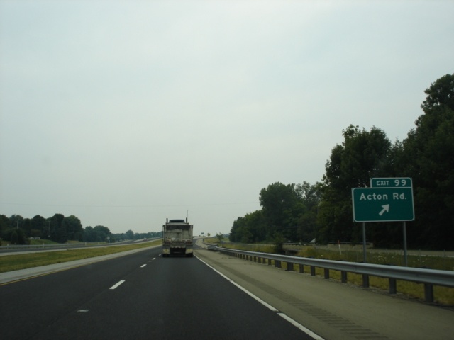 Interstate 74 West and U.S. 421 North approaching Exit 99 - Acton Road - 1/2 mile. Acton is about two miles south of the interstate. (Photo taken 7/11/05) |